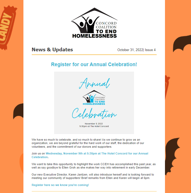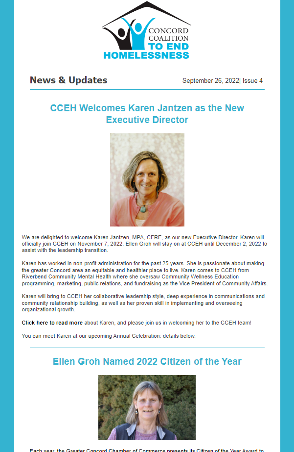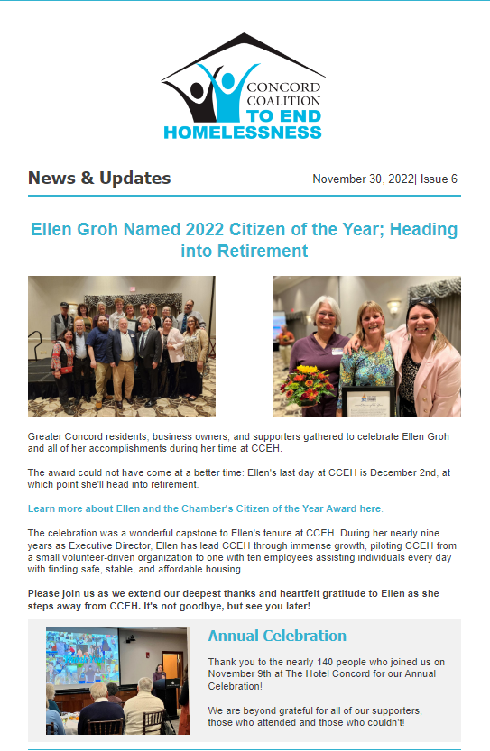 Founded in 2008, the Concord Coalition to End Homelessness (CCEH) is a private nonprofit dedicated to eliminating homelessness in our community.