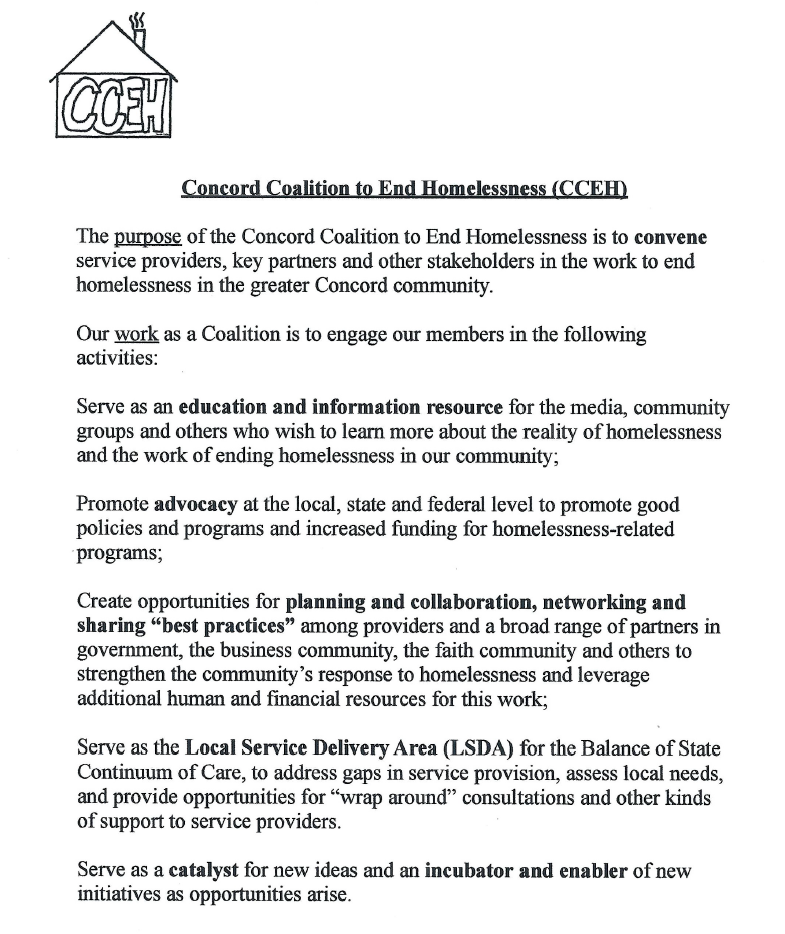 In the spring of 2008, a group of service providers and faith-based organizations came together with the goal of coordinating their efforts to provide needed services, share information and expertise, and to seek funding opportunities to end homelessness in Concord. From this, CCEH was born in June of 2008, and received 501(c)3 status in August the same year.