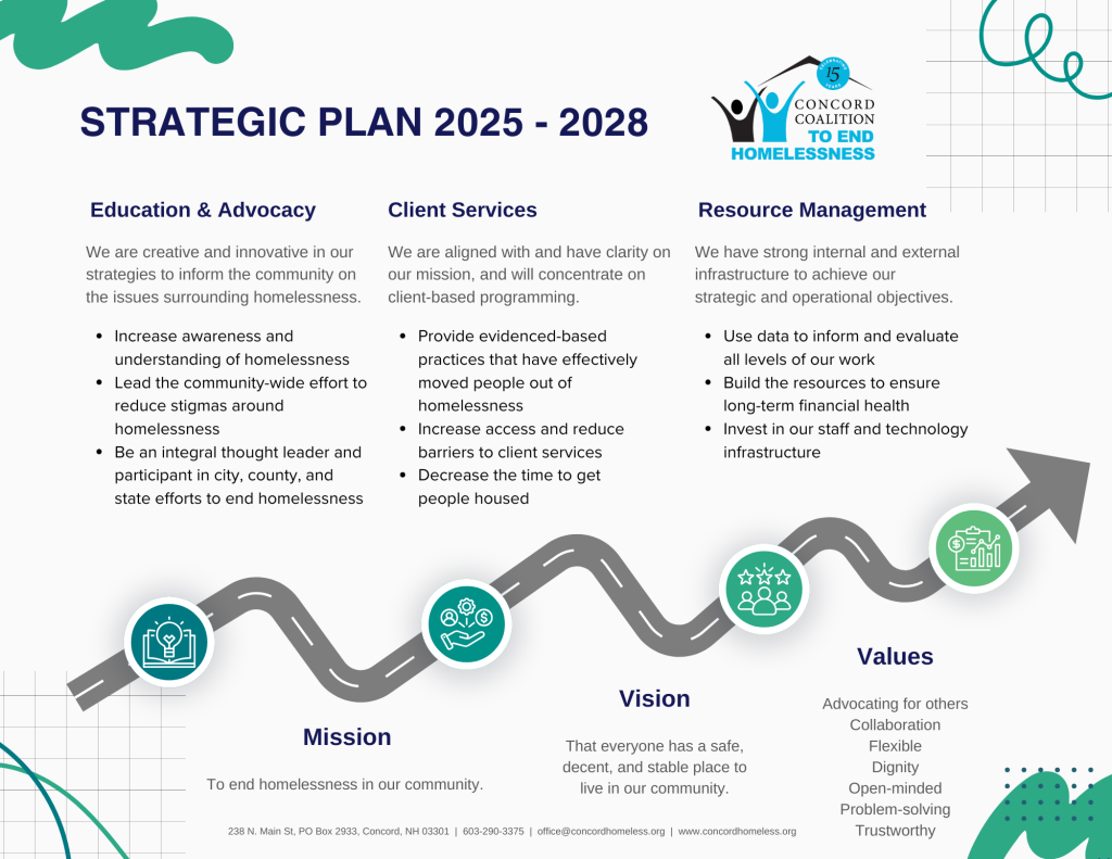 Members of CCEH Board of Directors worked with numerous stakeholders on a mayoral Steering Committee to create Concord’s Plan to End Homelessness, which was adopted by the City Council on April 14, 2014. In that same year, CCEH hired its first Executive Director, and became the lead agency for implementation of the city’s Plan. The organization stepped up its efforts around permanent supportive housing.